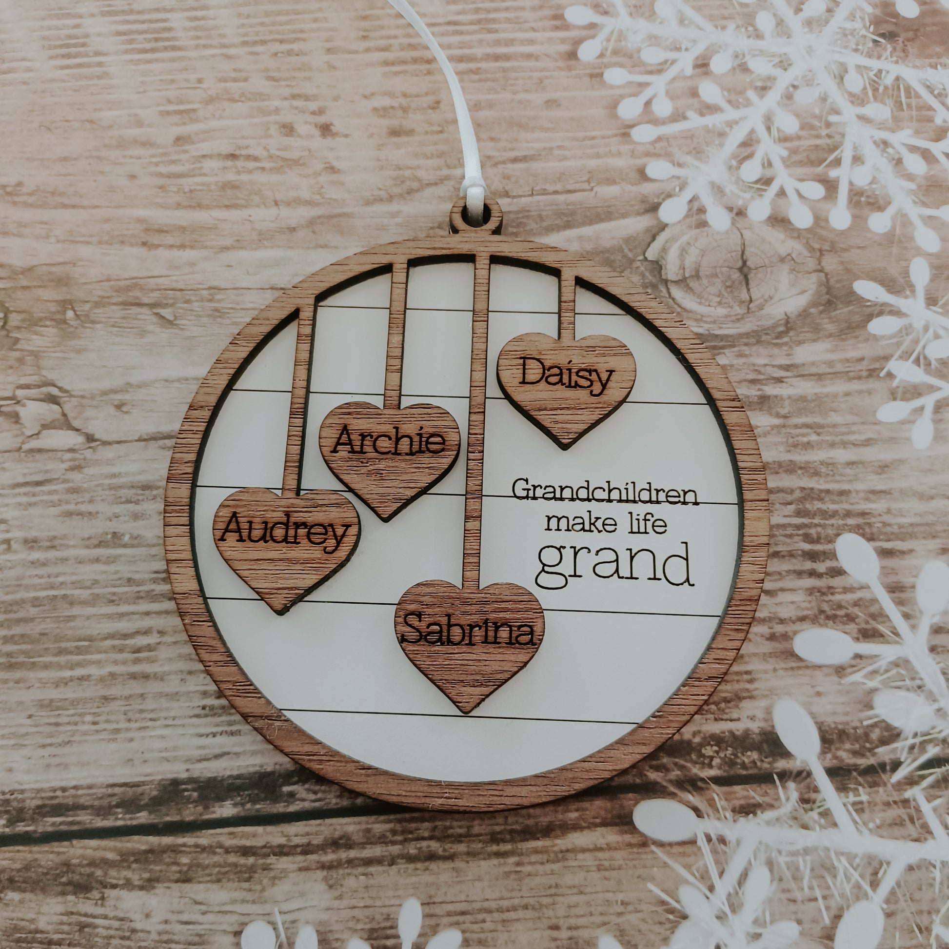 Our grandchildren make life grand Christmas ornament are the perfect addition to your tree or they make a beautiful Christmas gift.